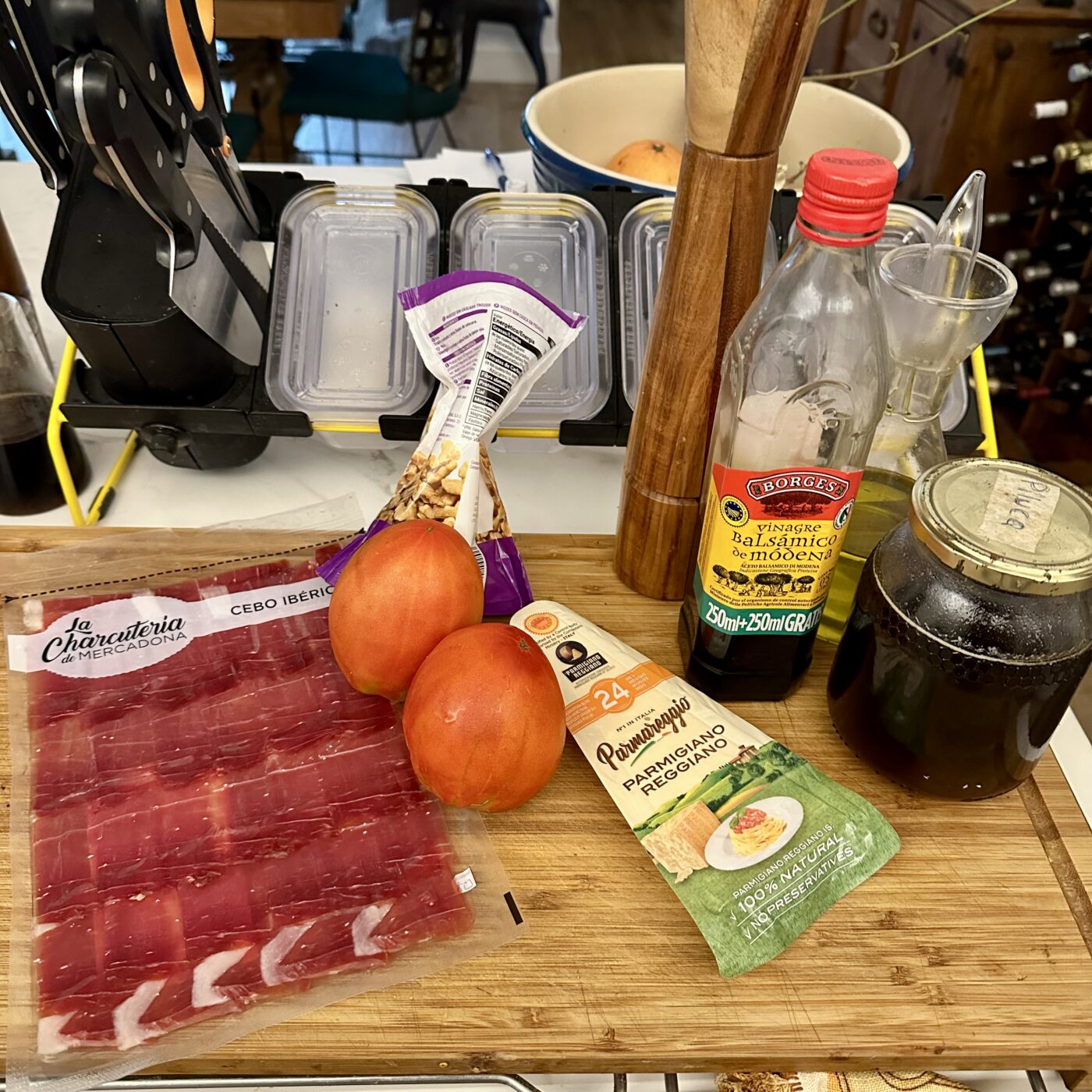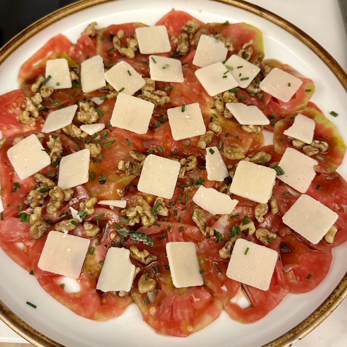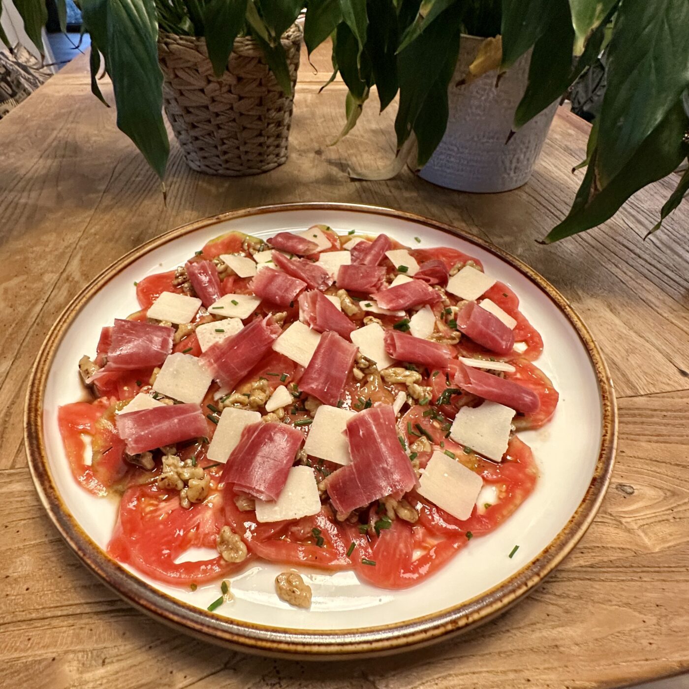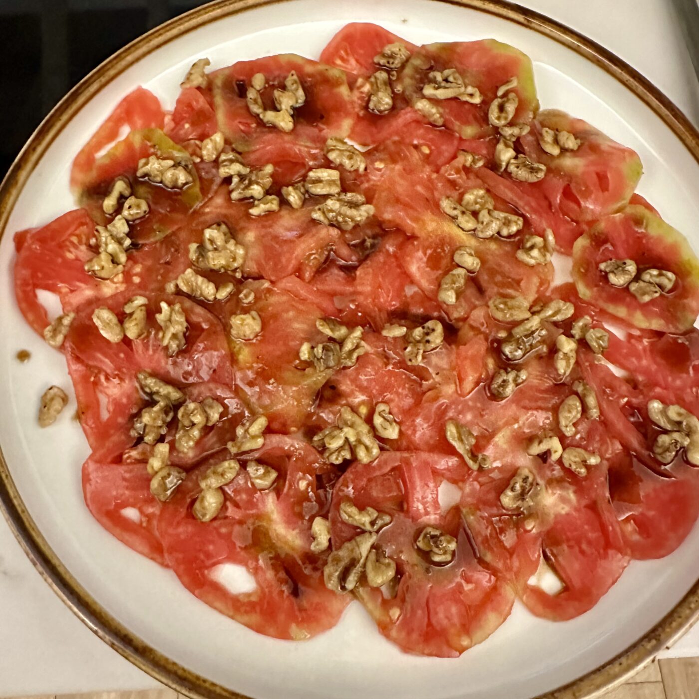 Hay carpaccios que se pagan a precio de oro en restaurantes finos… y luego está este, que te montas en casa con cuatro cosas buenas y quedas como un rey. Tomate, jamón ibérico, lascas de parmesano, un par de nueces para dar crunch y una vinagreta con miel que redondea el plato.