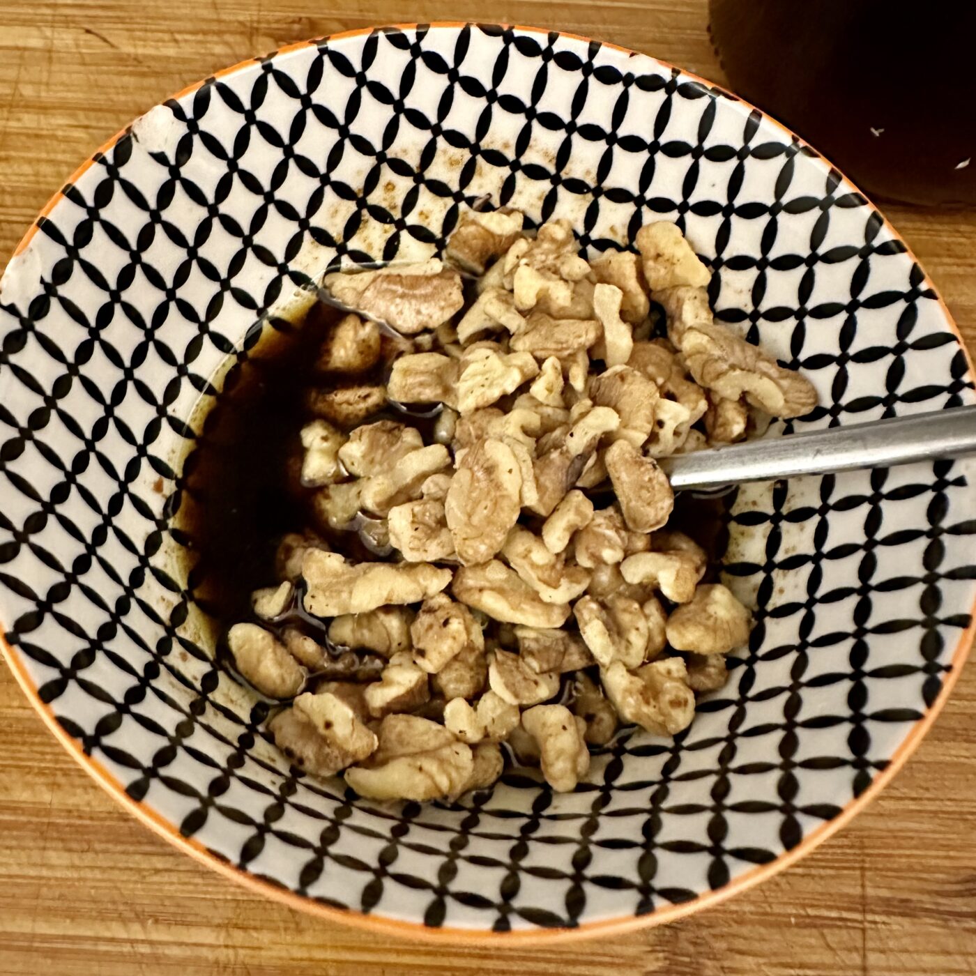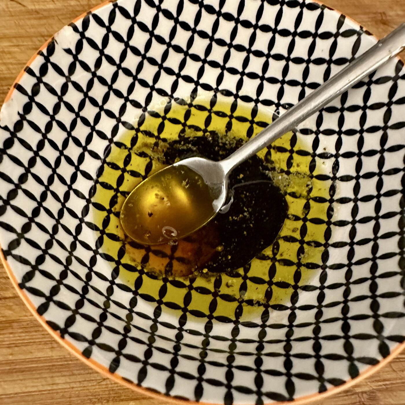 Preparar una vinagreta con 3 cucharadas de AOVE, 1 cucharada de vinagre, un poco de sal, 1 cucharadita de miel y un golpe de pimienta recién molida.