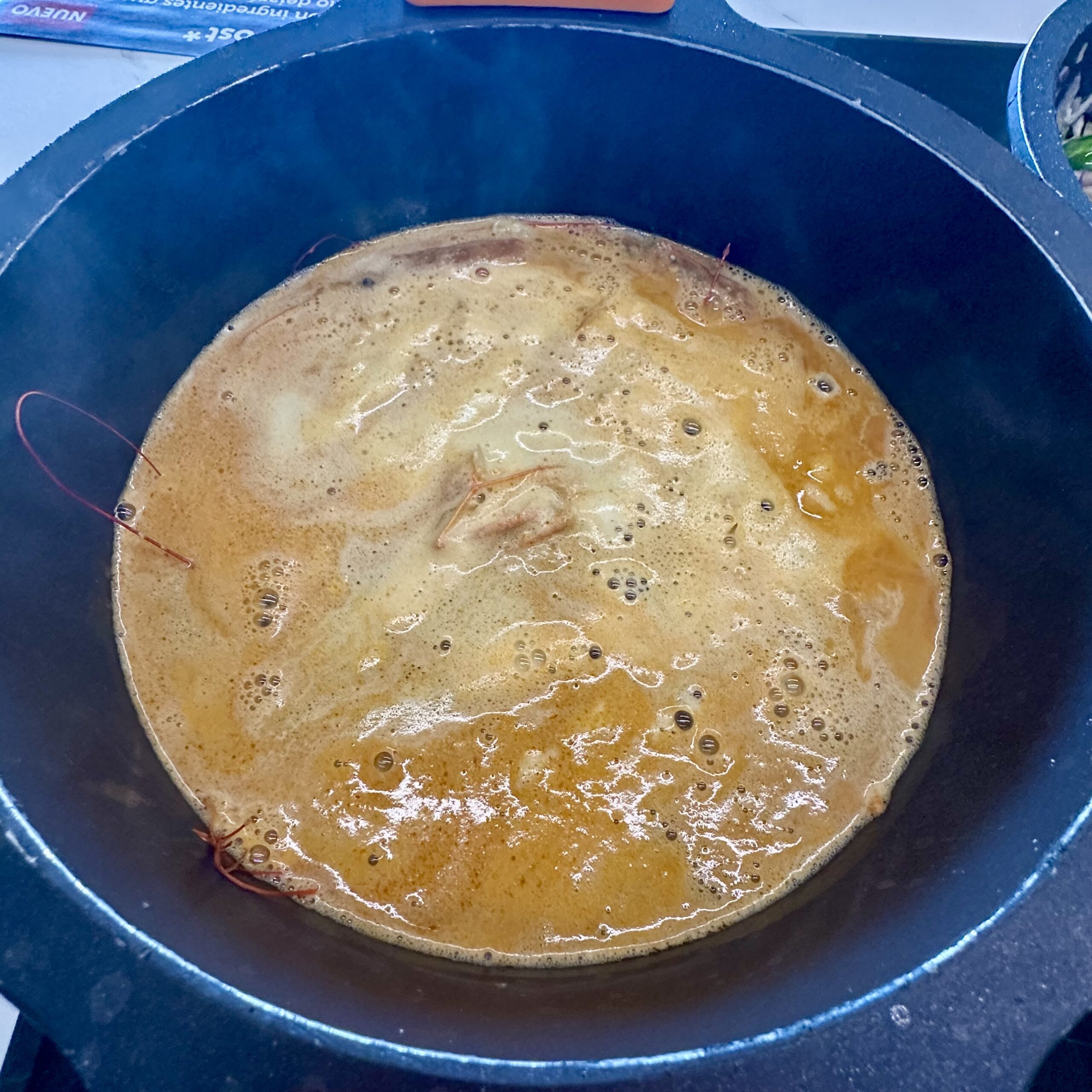 Caldo de langostinos: Sofreímos las cabezas y cáscaras en AOVE, añadimos ½ vaso de vino blanco y ½ vaso de agua. Cocemos 10 min, colamos y reservamos.
