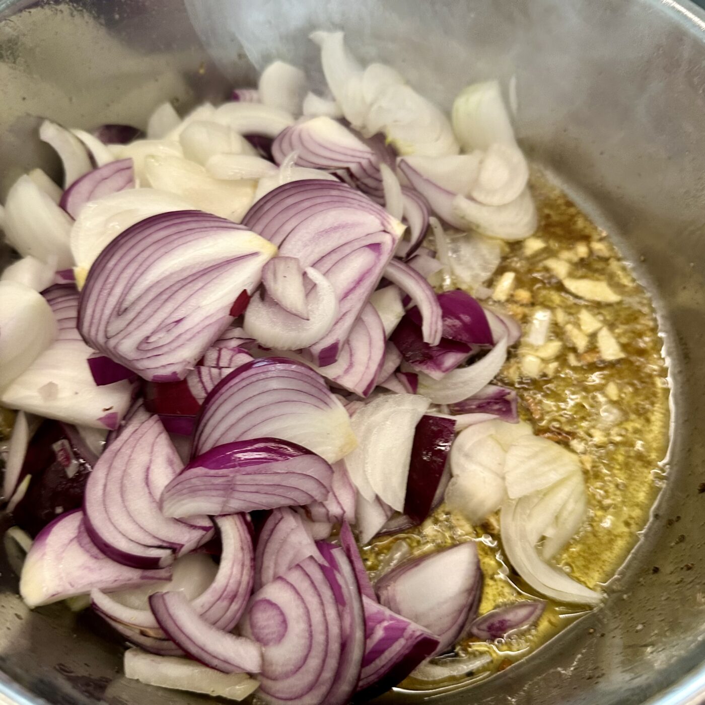 Añadimos las dos cebollas en juliana y un poco de sal. Dejamos pochar unos 5 minutos.