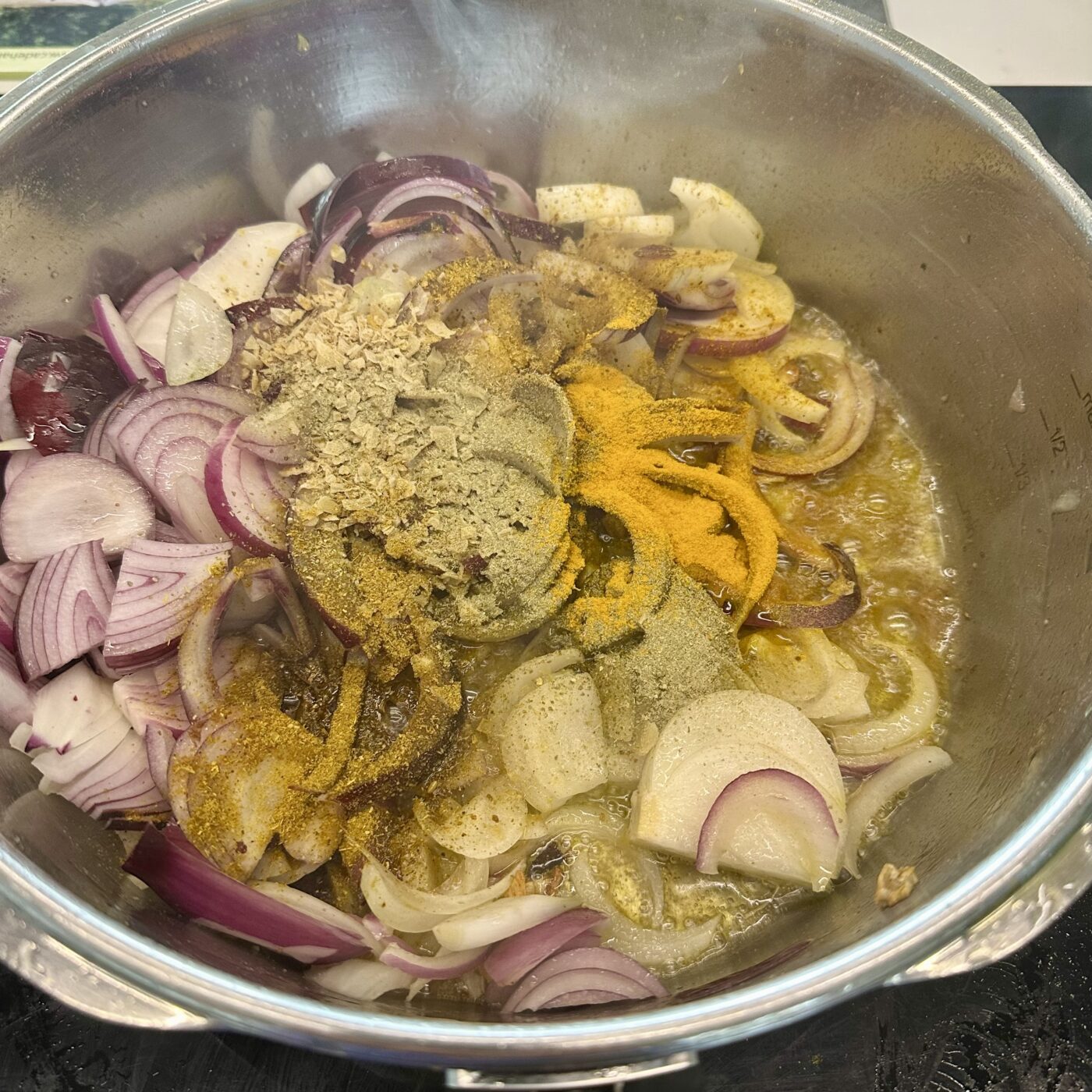 Añadimos todas las especias secas. Que no te dé miedo: curry, cúrcuma, jengibre… y si eres de emociones fuertes, alguna mezcla cañera. Remueve bien para que suelten aroma.