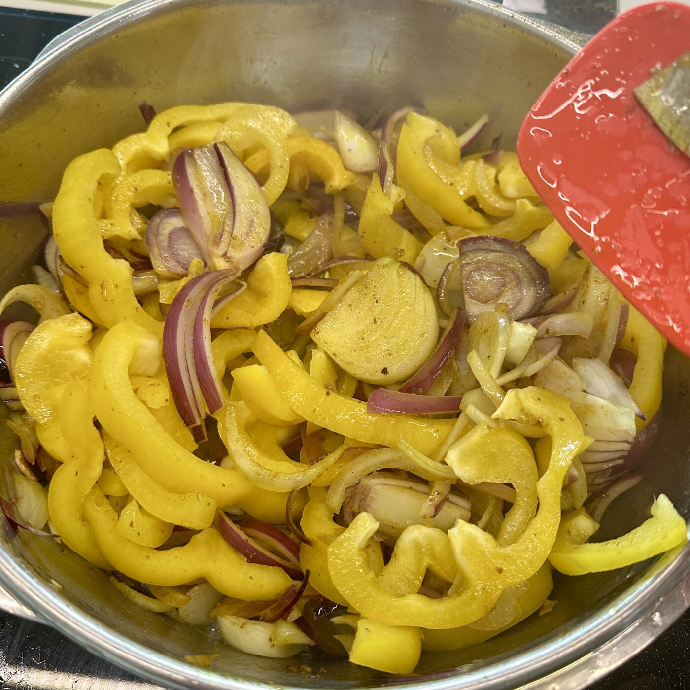 Añadimos los pimientos en juliana y dejamos pochar 5 minutos más.