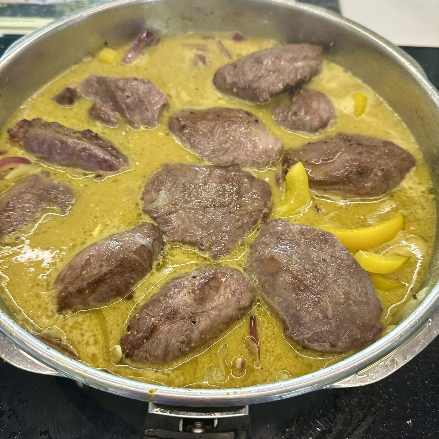 Incorporamos la leche de coco y devolvemos las carrilleras a la olla. Cubrimos con el caldo de pollo, rectificamos de sal y cerramos la olla.