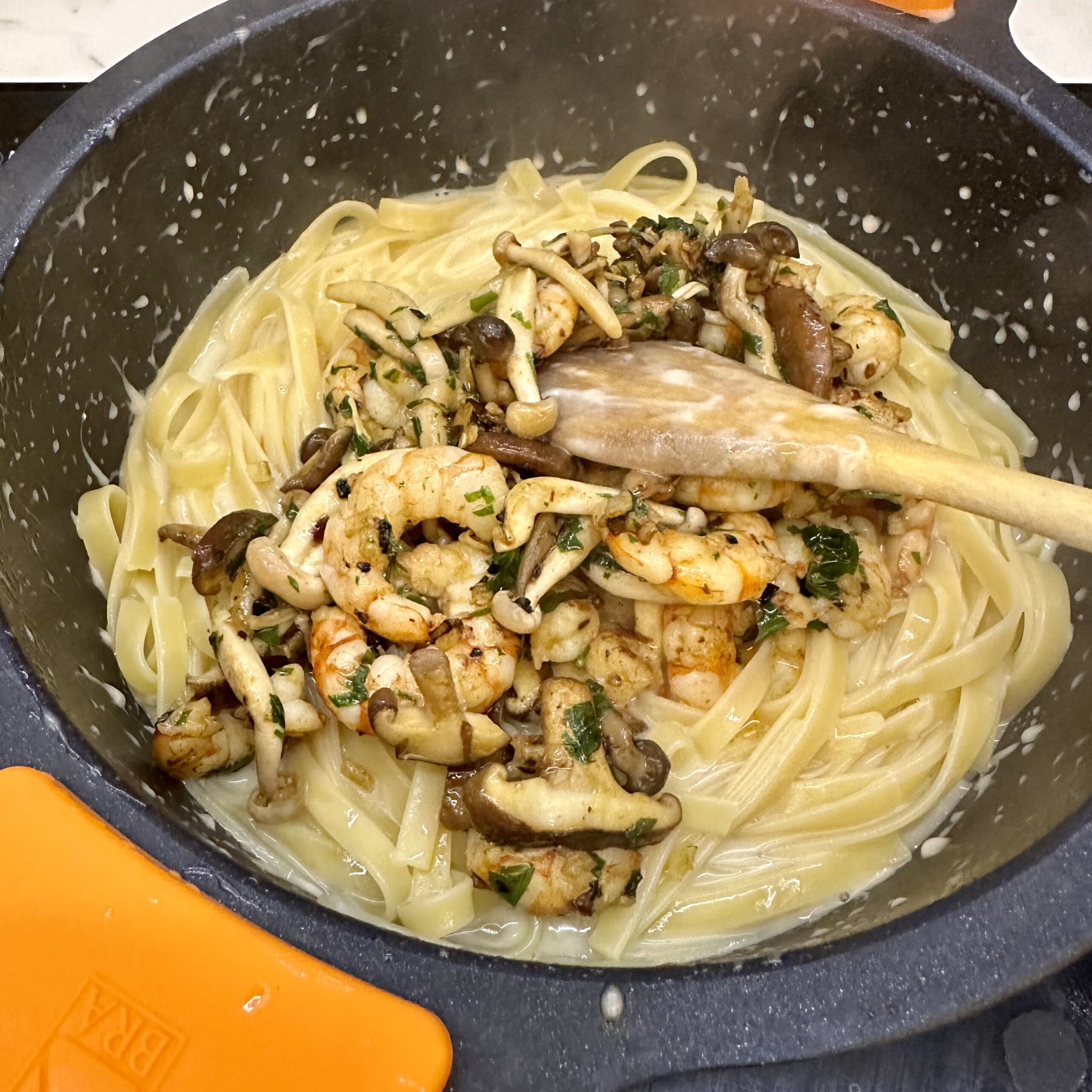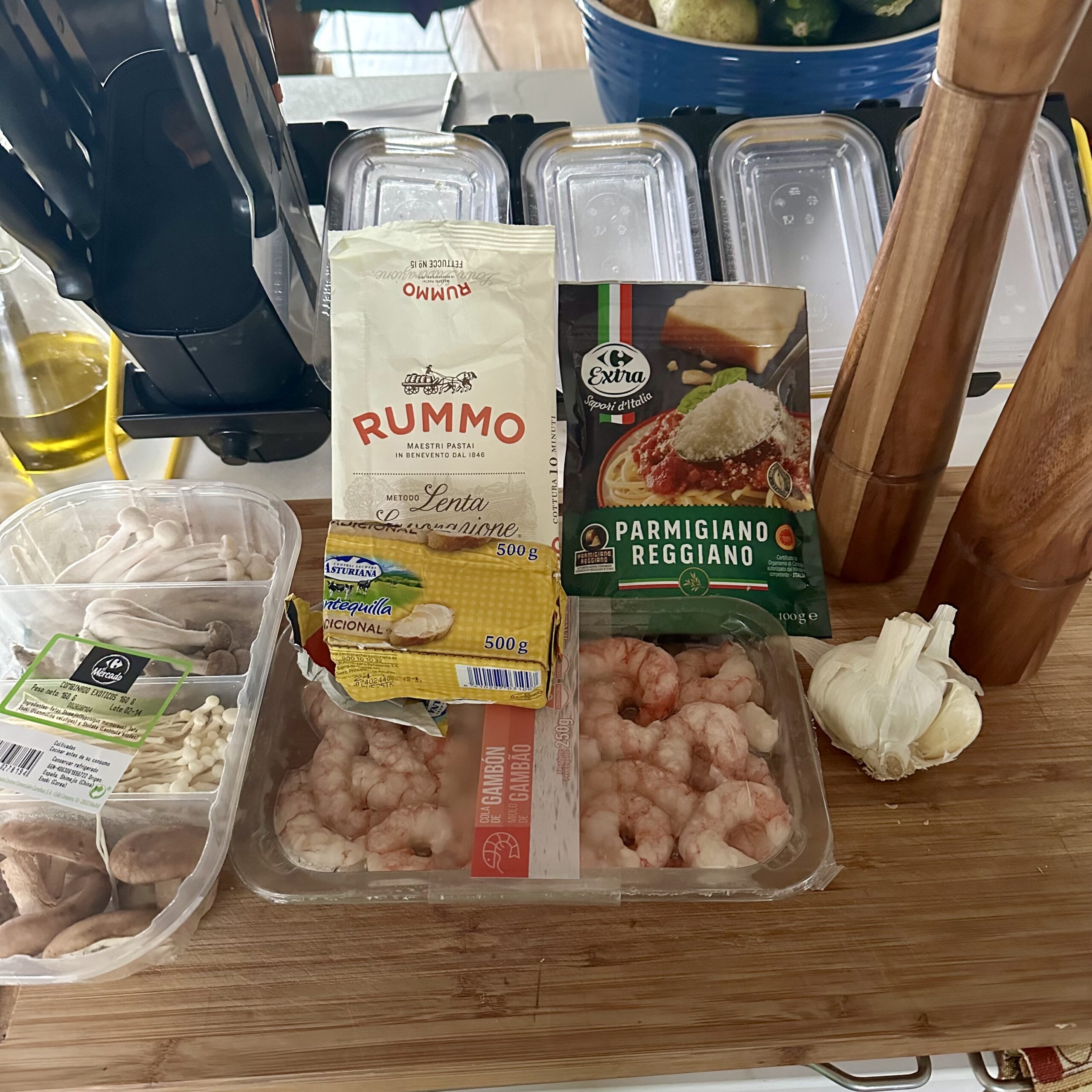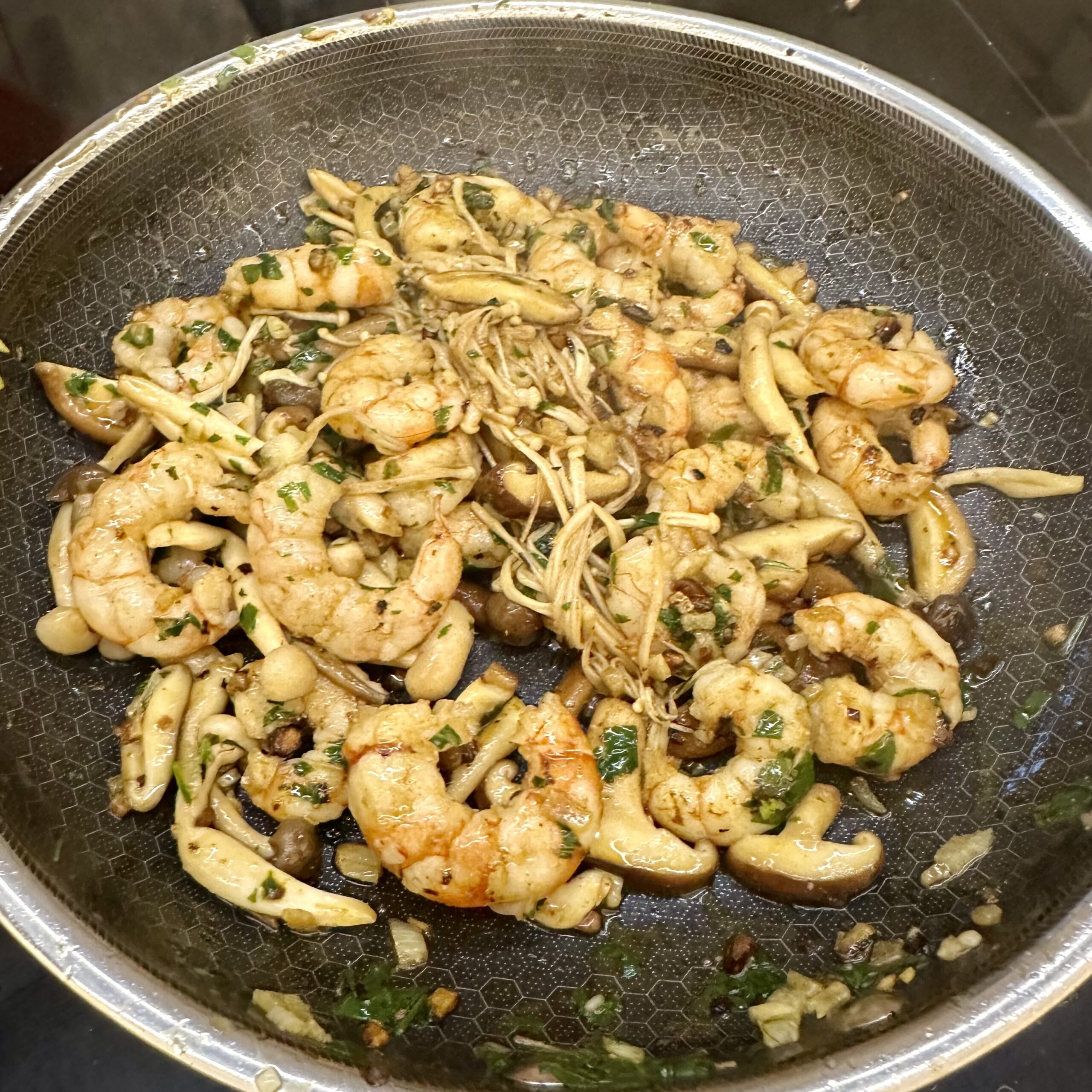Incorporamos las gambas y las setas y seguimos removiendo un par de minutos más.
