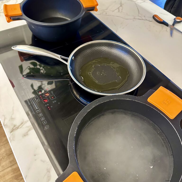 Una sartén con un buen chorro de AOVE a calentar