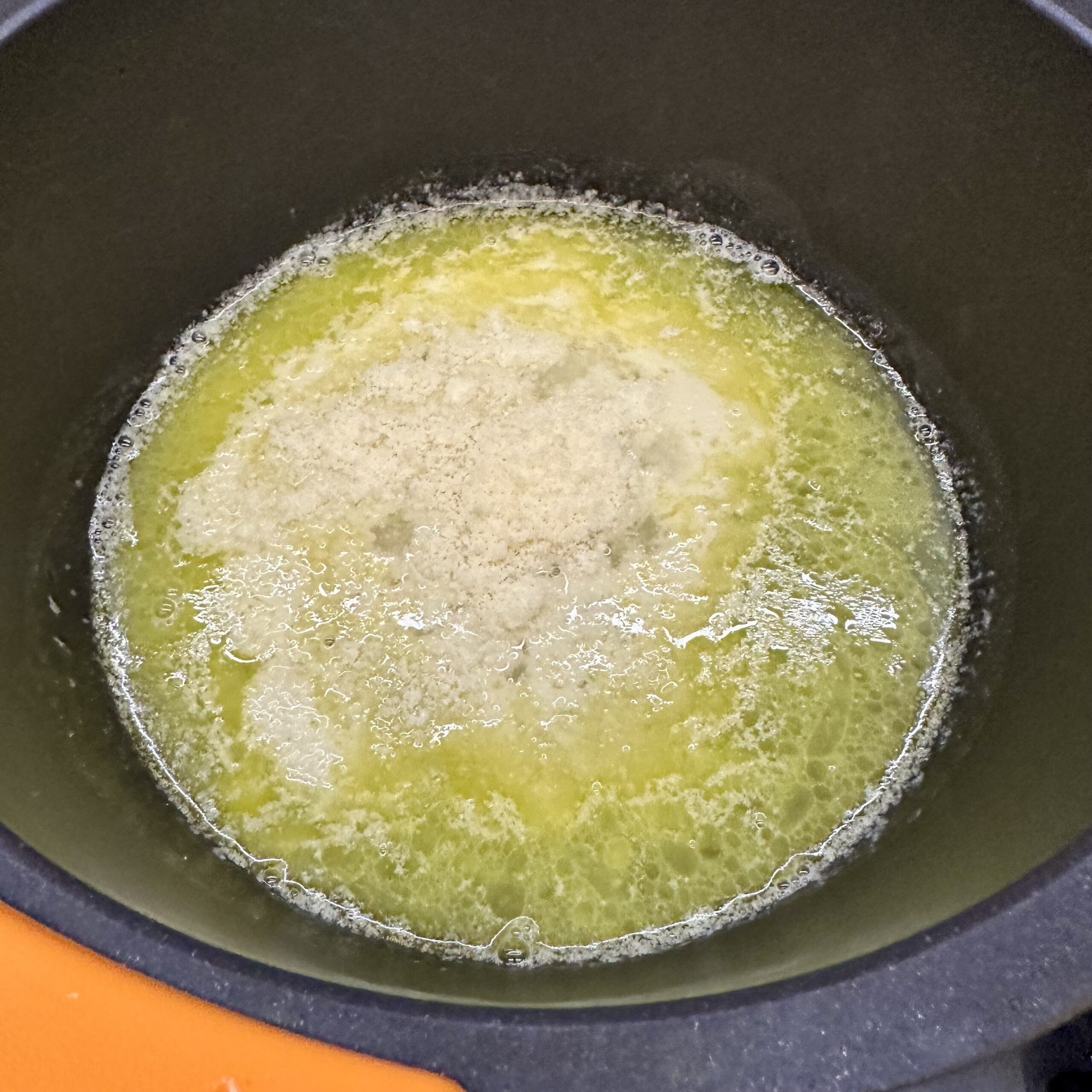 Una vez que se funda la mantequilla, añadimos el parmesano rallado y removemos con unas varillas para que se funda.