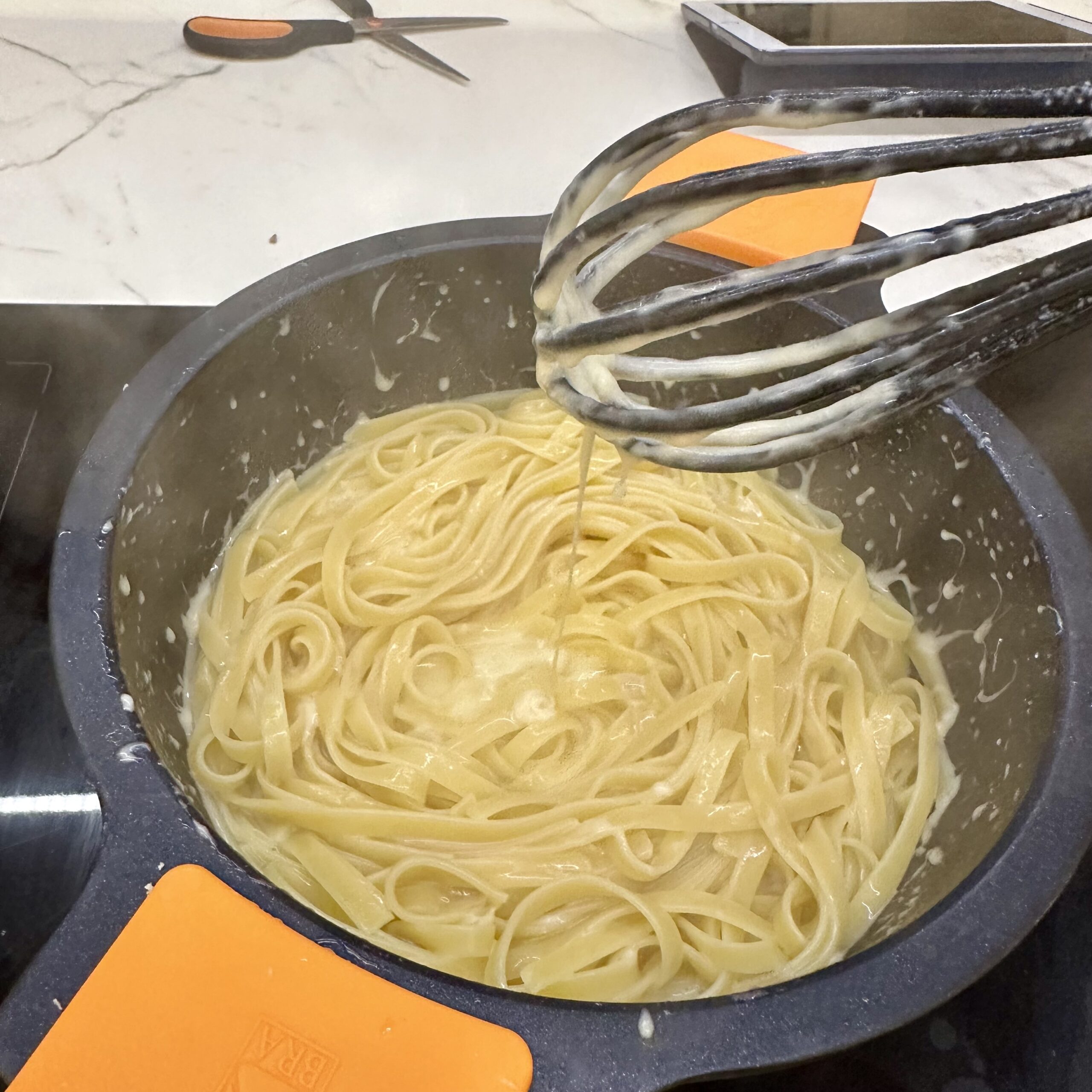 Incorporamos la pasta a la salsa de queso y mantequilla y el agua de cocción. Removemos durante 2 minutos con una varillas para que se mezcle bien y quede cremoso.