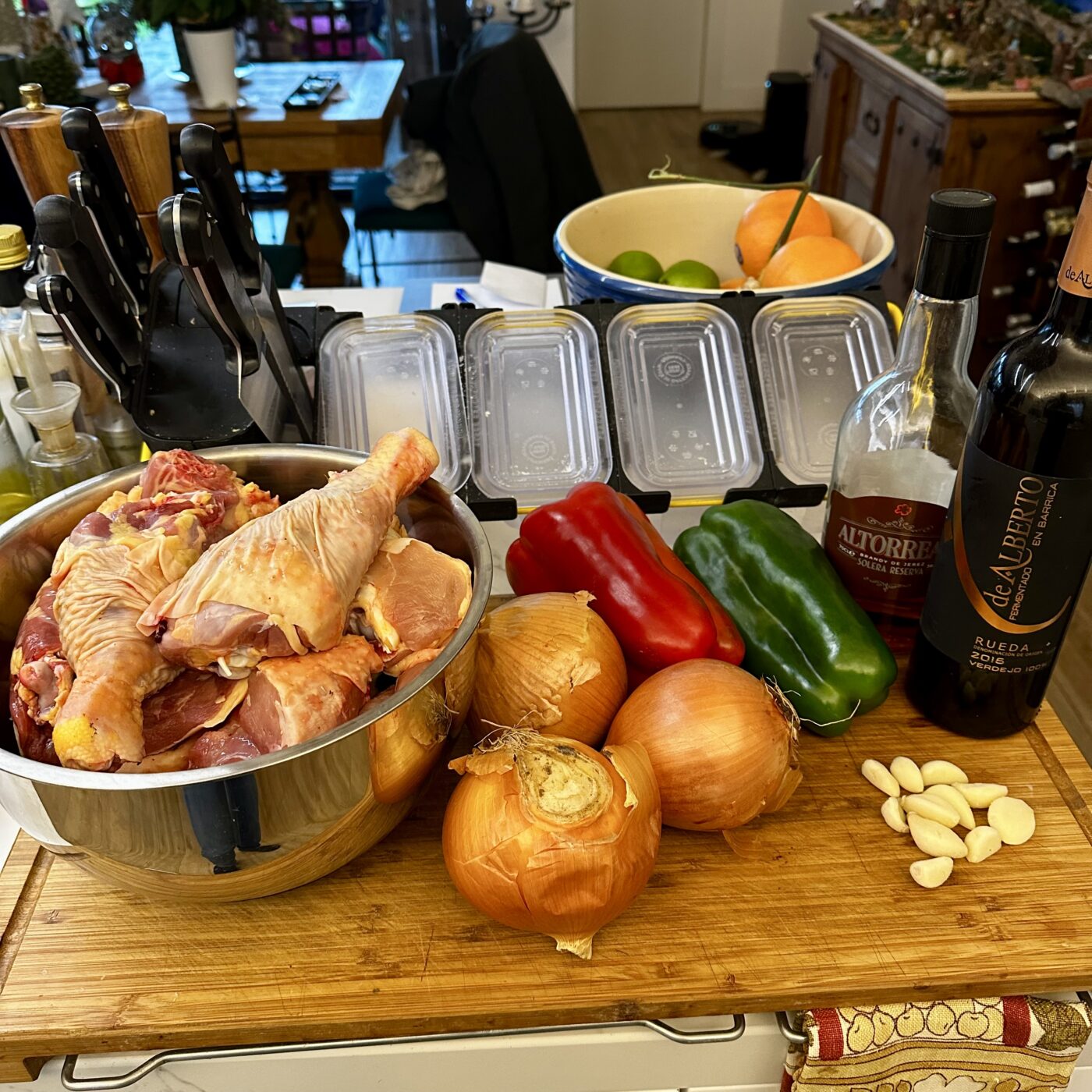 Adobamos el pollo con ajo picado y sal, y lo dejamos reposar durante el tiempo que tarda en hacerse el caldo. Mientras tanto, picamos todas las verduras.