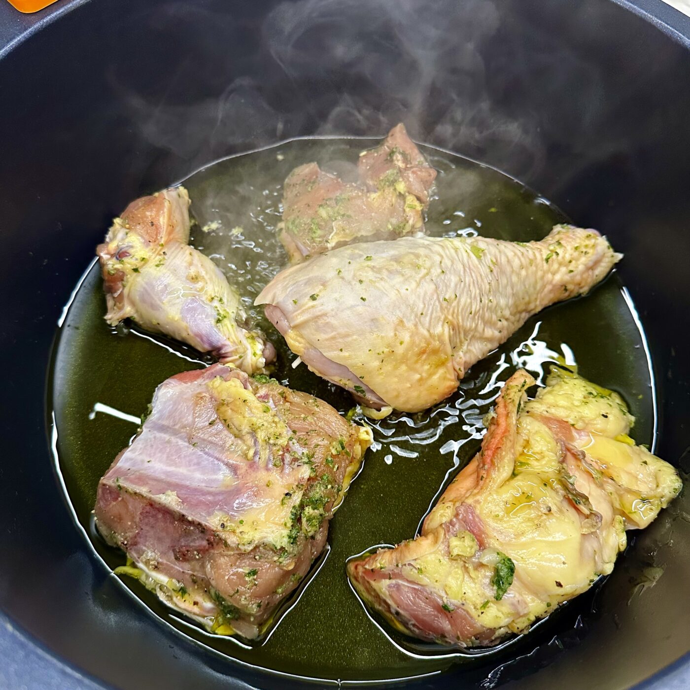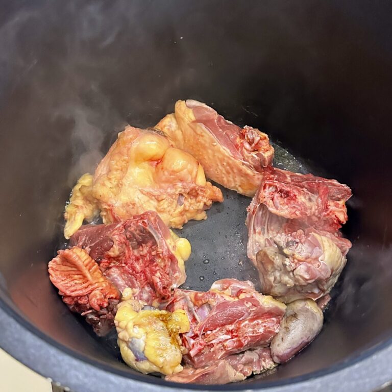 Doramos el pitu en una cazuela amplia con AOVE hasta que coja buen color. Reservamos.