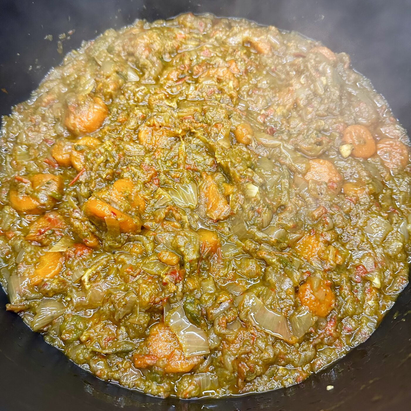 Cuando las verduras estén bien caramelizadas, las trituramos añadiendo caldo poco a poco hasta conseguir una salsa espesa y cremosa.