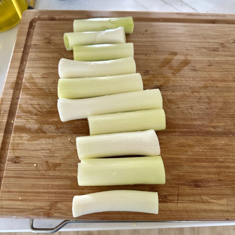 Limpiamos bien los puerros, pelamos y retiramos la parte más verde.