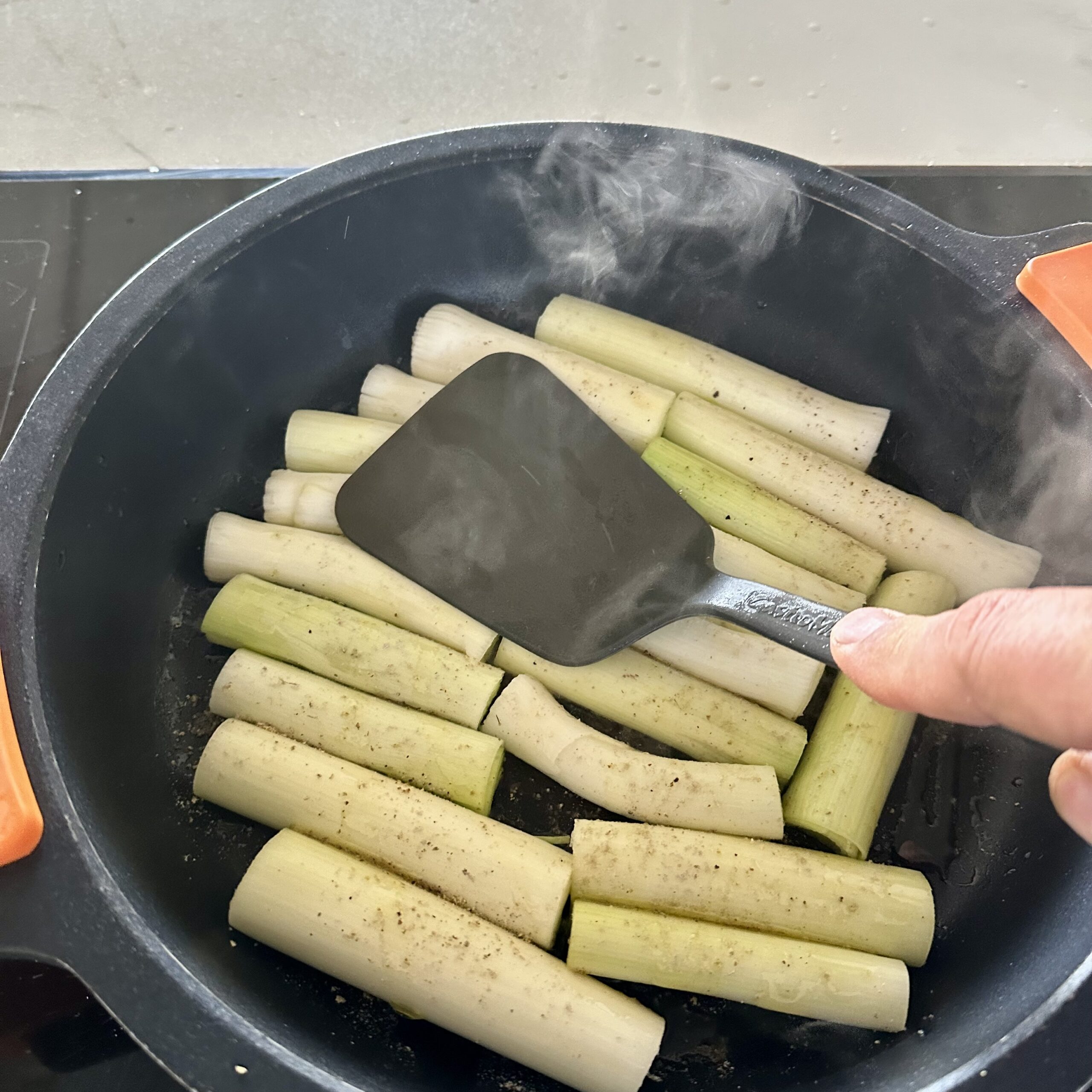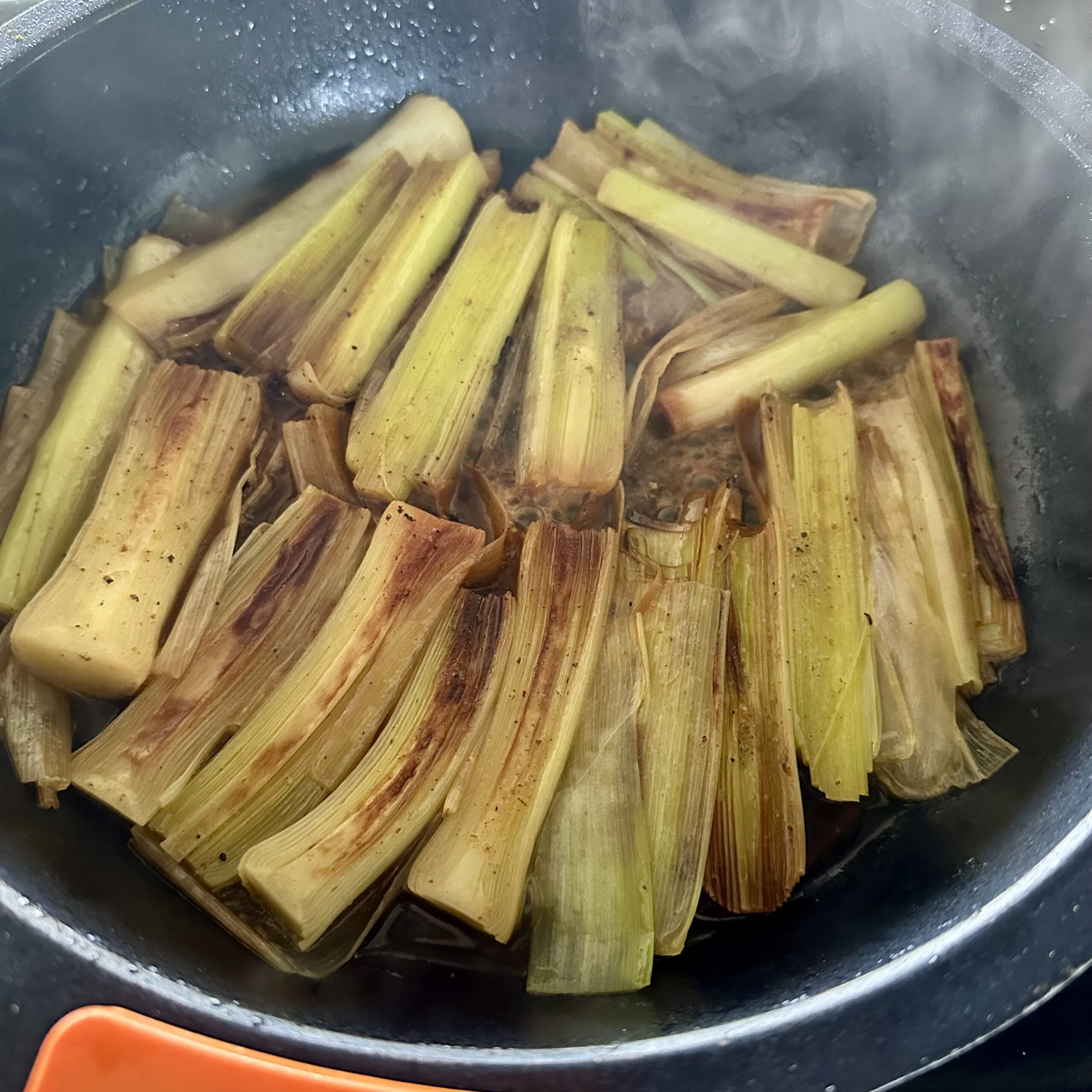 En una cazuela baja, calentamos un chorrito de AOVE. Cuando empiece a humear, colocamos los puerros por la parte plana.