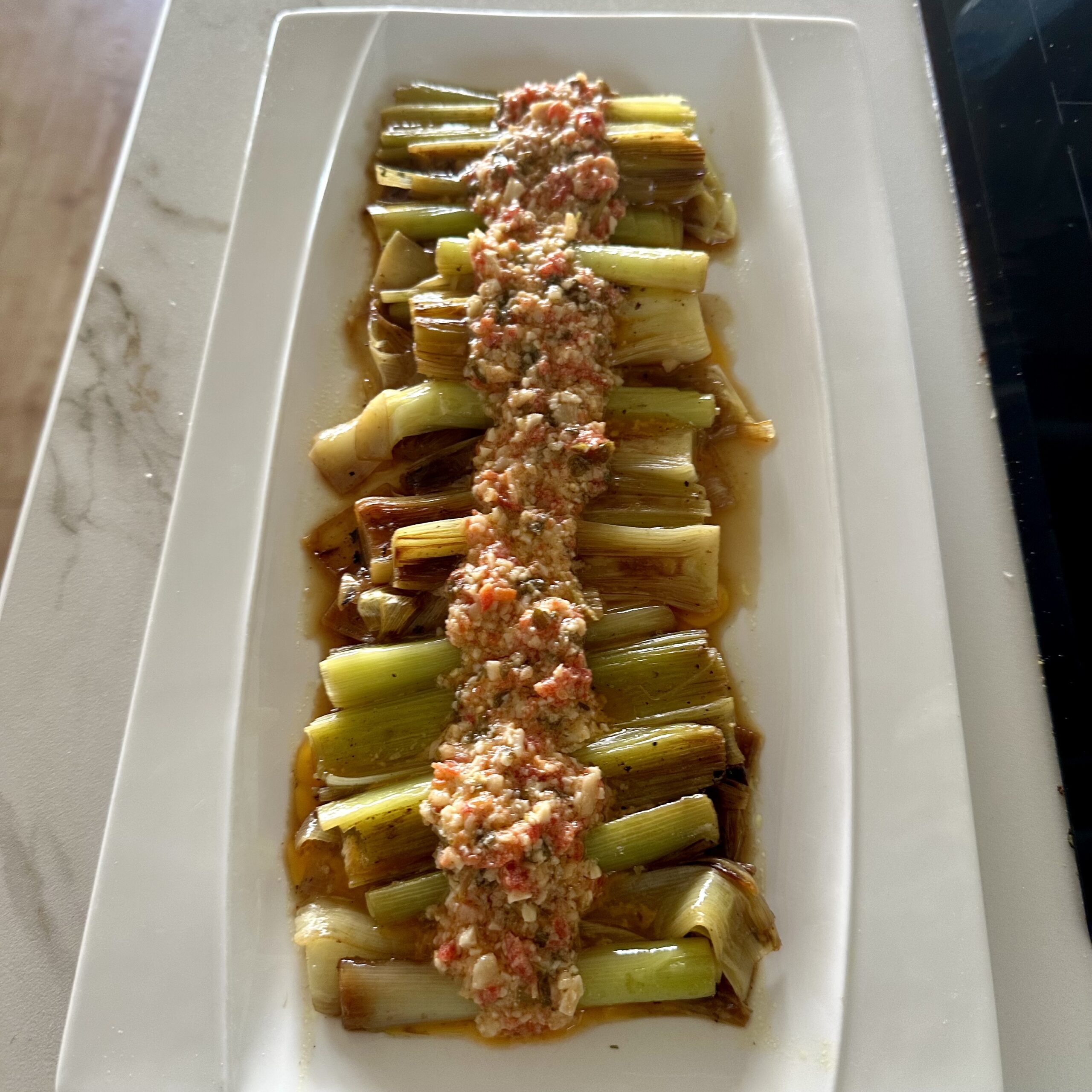 Si te va lo cremoso, puedes poner una cama de burrata debajo delos puerros.