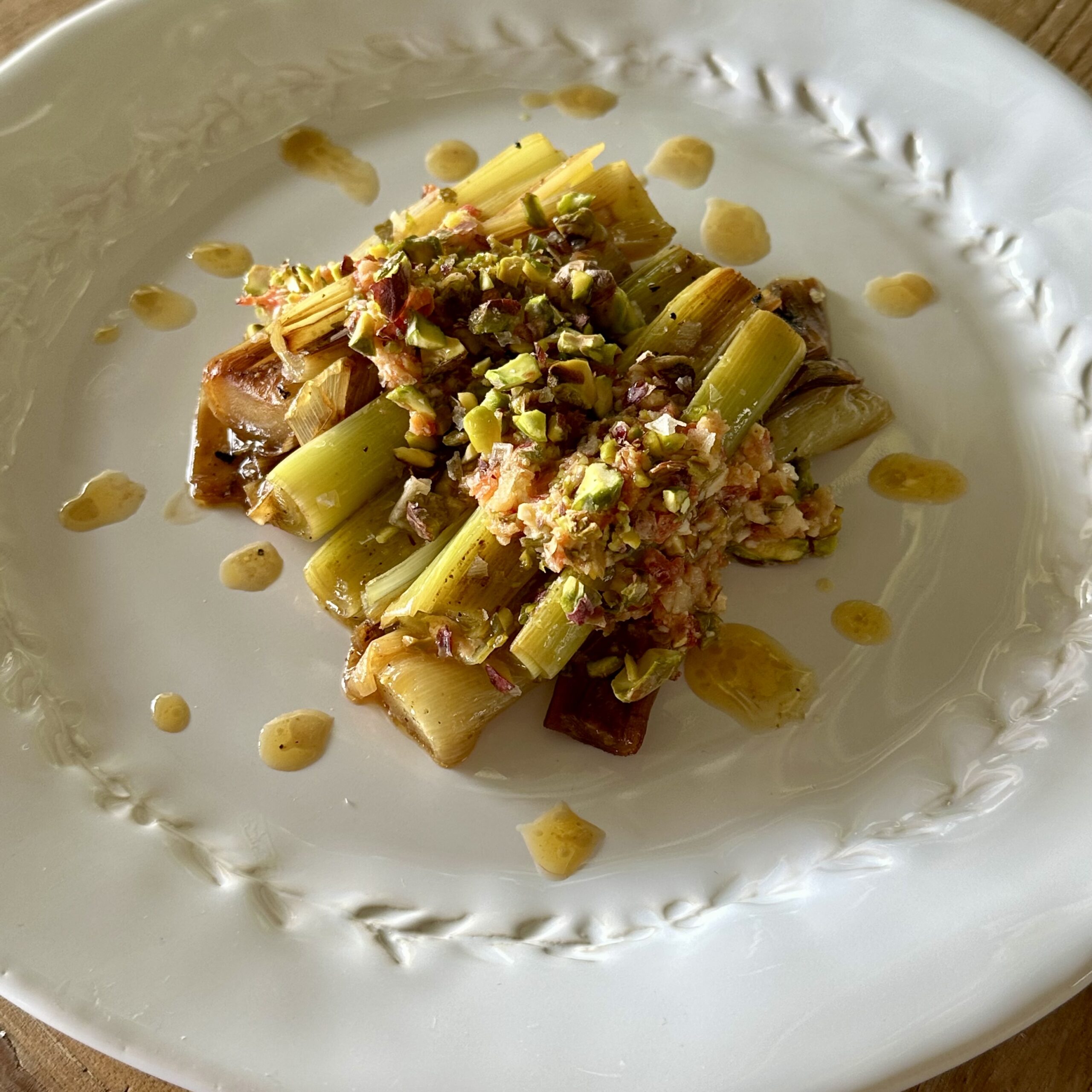 Los puerros no suelen ser los protagonistas… hasta que los pones a la plancha, los aromatizas con especias del Magreb y los coronas con una vinagreta que levanta pasiones. Ah, y pistachos, porque la vida con crujiente sabe mejor.