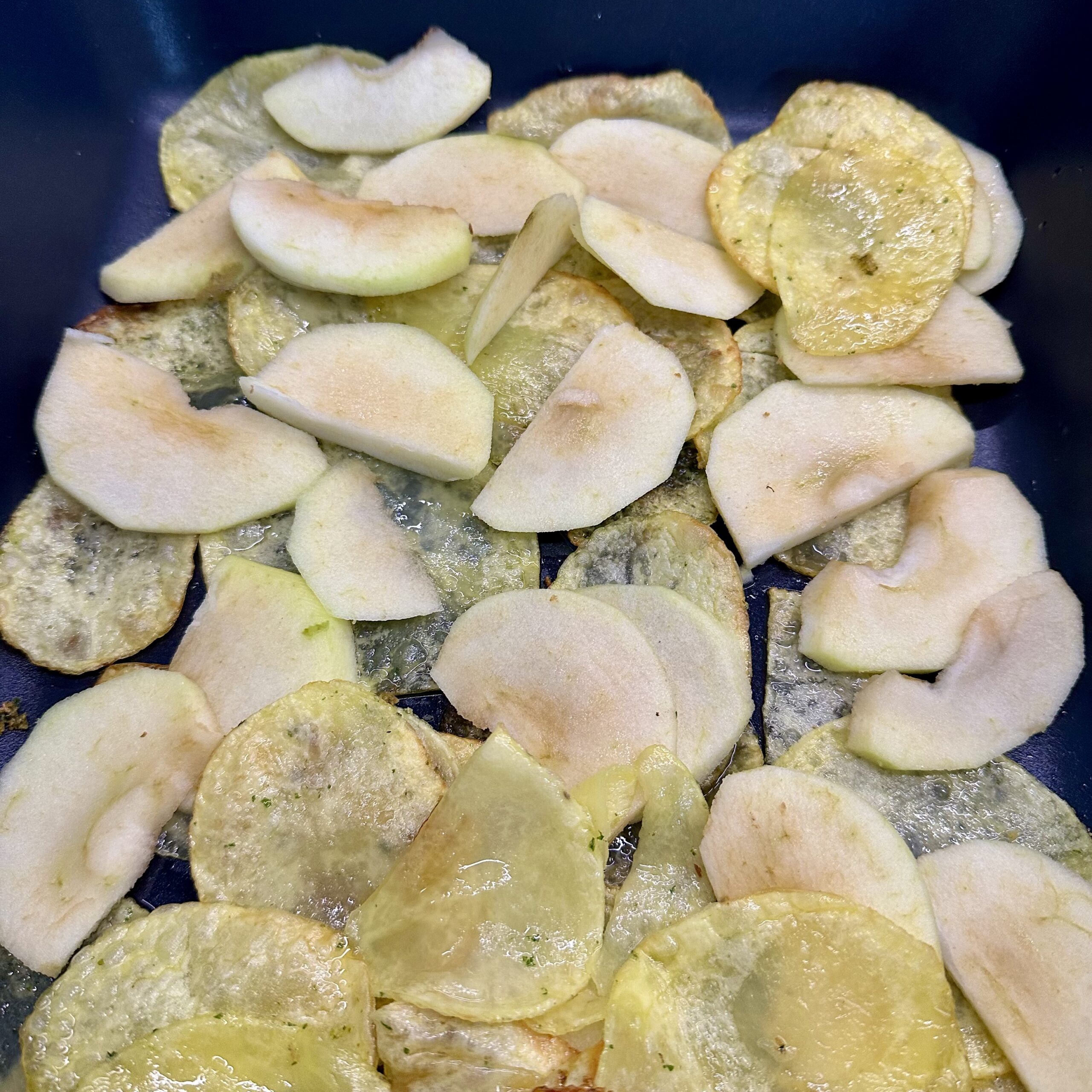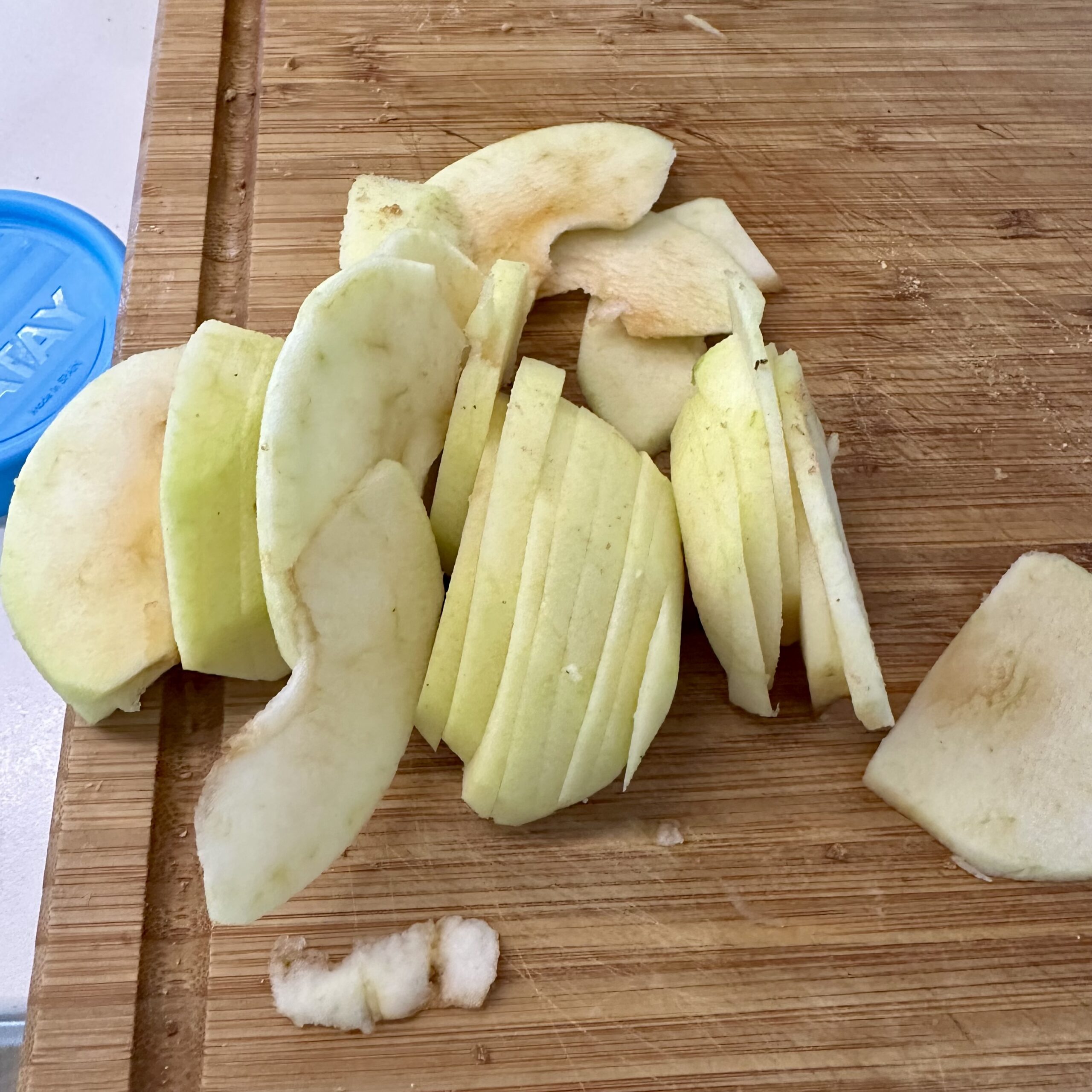 Pelamos la manzana y la cortamos en láminas. Este toque dulce es lo que convierte este plato en algo especial, no os lo saltéis.
