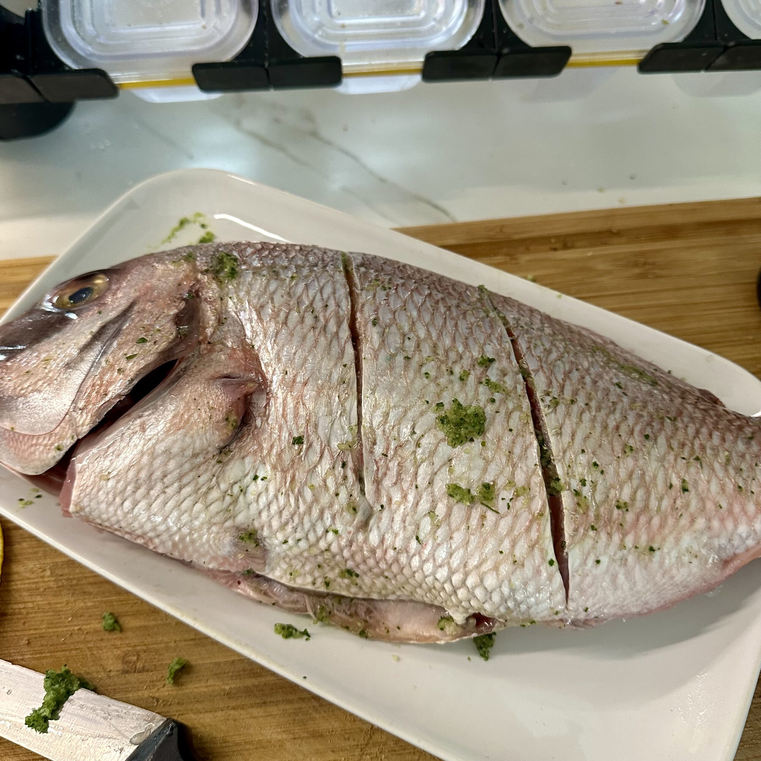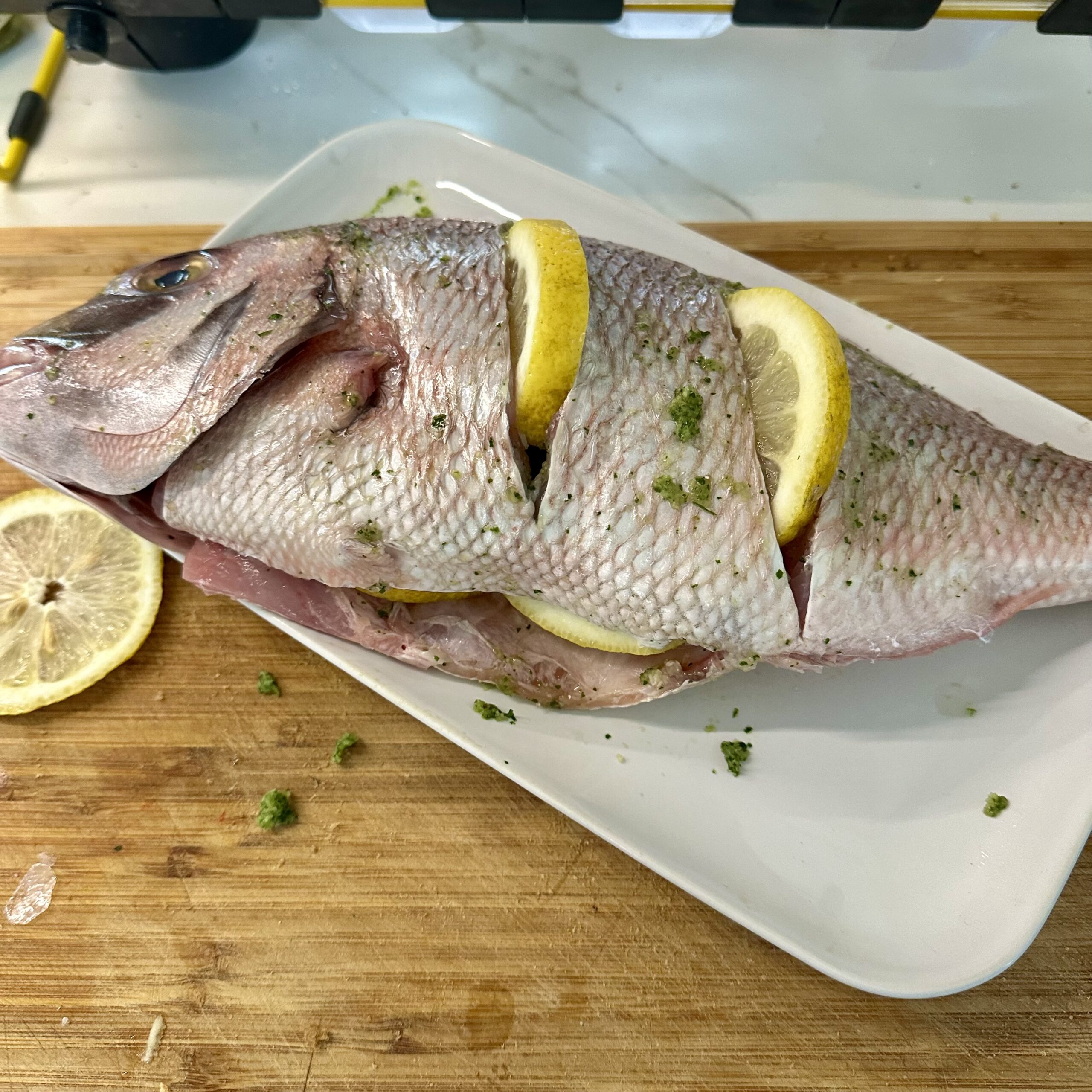 Untamos el pescado con ajoperejil por dentro y por fuera, masajeándolo como si estuviera en un spa.