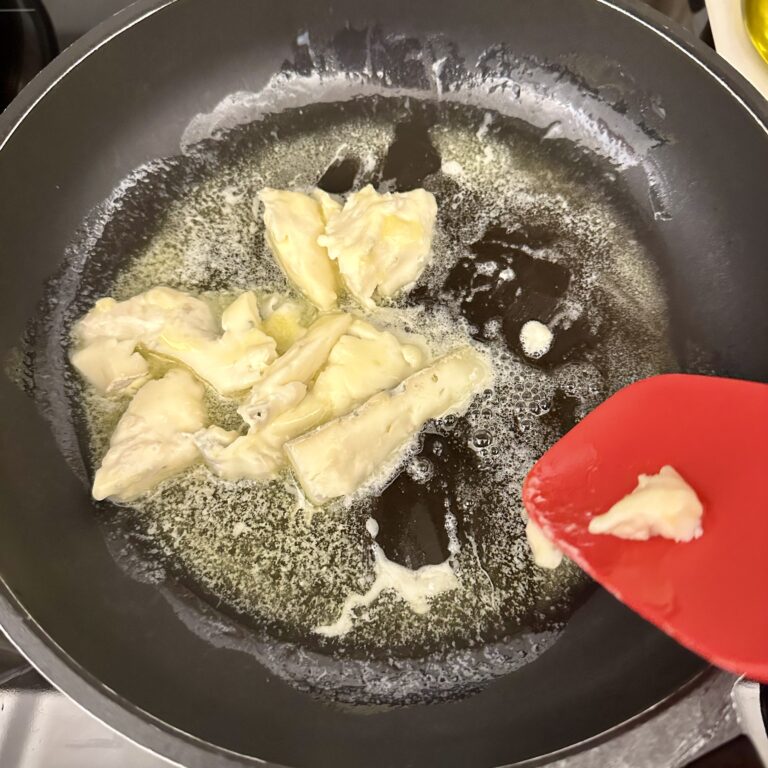 Lo cocinamos en una sartén bien caliente con un chorrito de AOVE, vuelta y vuelta, hasta que esté dorado por fuera y jugoso por dentro (1 minuto por cada lado, más o menos).