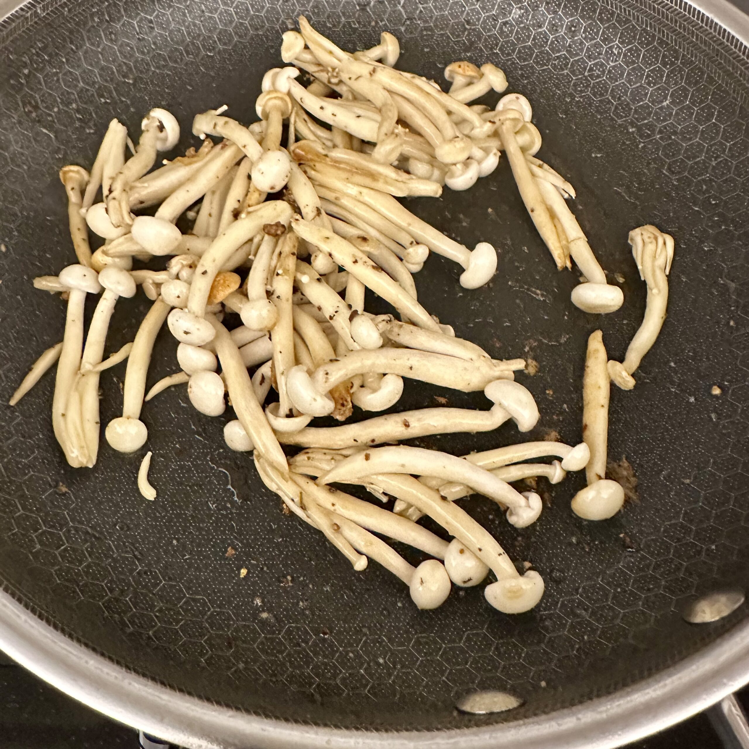 En la misma sartén, salteamos los shimeji 1 minuto con un poco de AOVE y sal. Nada más. Que mantengan textura.